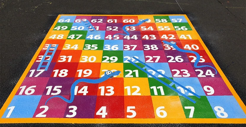 Traditional playground games - Classic layouts such as hopscotch markings, snakes and ladders, four square, and skipping grids that promote coordination and turn-taking.